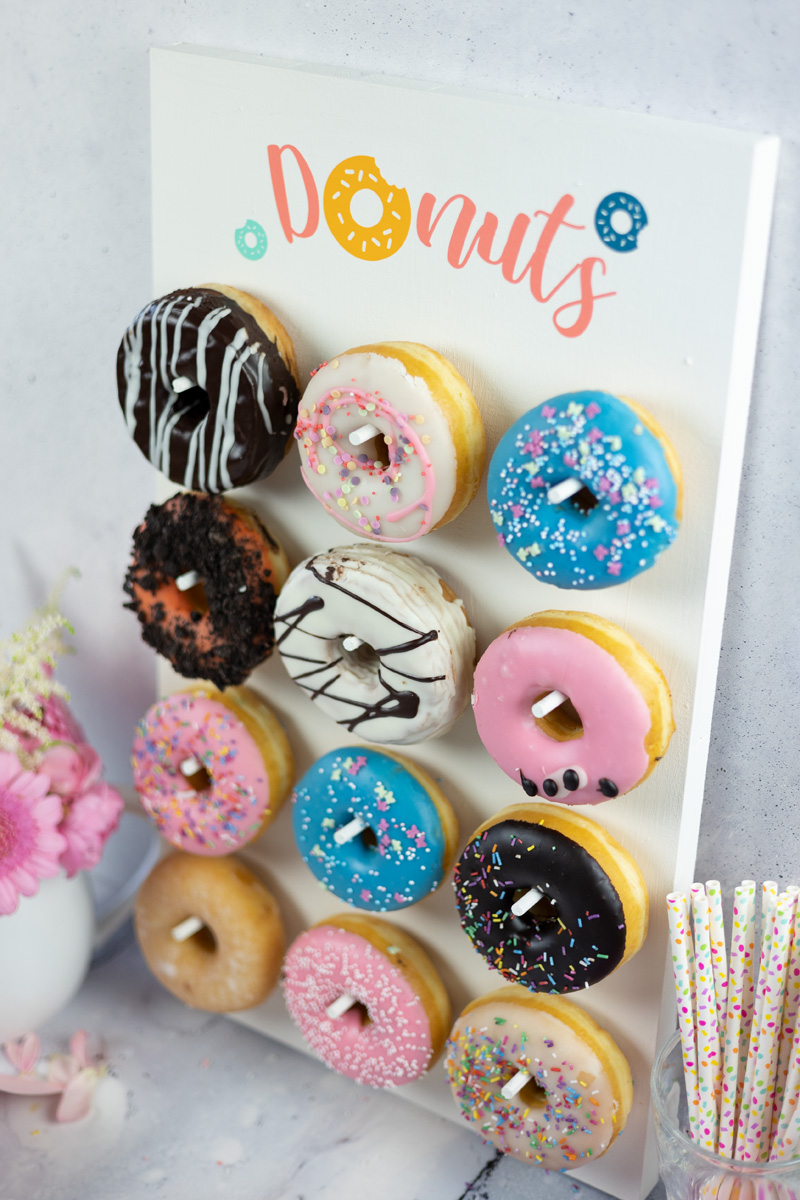 20. Zum Schluss kommt das Allerbeste: Die Donuts werden auf die Rundhölzer auf der Donut-Wall angehangen und können den Gästen serviert werden!