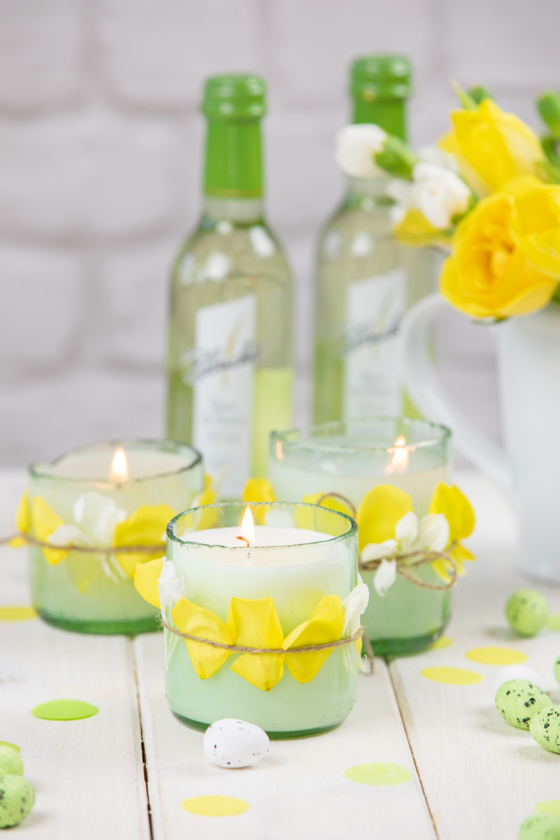 Diese Frühlings-Kerzen habe ich aus leeren Weinflaschen gemacht. Mit einem einfachen Trick könnt ihr nämlich ganz leicht Glas schneiden bzw. brechen. Im Beitrag zeige ich euch, wie das geht.